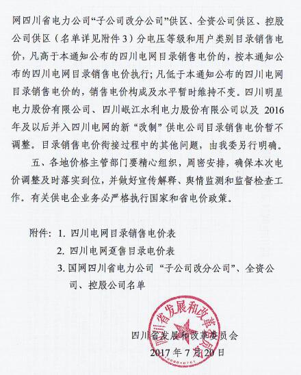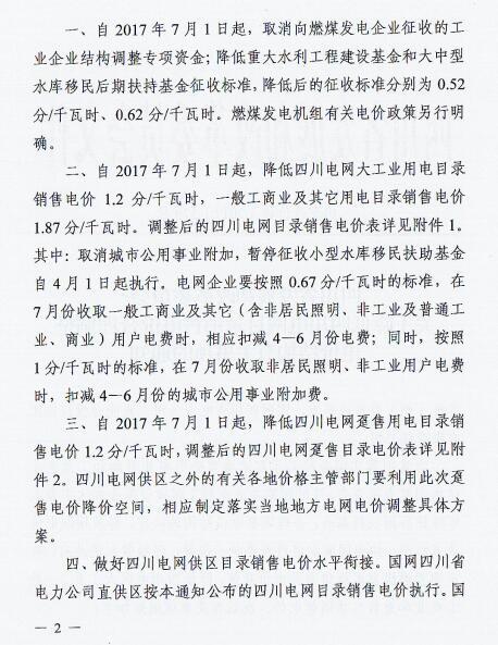近日,四川省發(fā) 改 委發(fā)布了《四川省發(fā)展和改革委員會關(guān)于降低四川電網(wǎng)目錄銷售電價(jià)合理調(diào)整電價(jià)結(jié)構(gòu)有關(guān)事項(xiàng)的通知》(以下簡稱“通知”)。通知指出,自2017年7月1日起,取消向燃煤發(fā)電企業(yè)征收工業(yè)企業(yè)結(jié)構(gòu)調(diào)整專項(xiàng)資金,降低重大水利工程建設(shè)基金和中大型水庫移民后期扶持基金征收標(biāo)準(zhǔn),降低后的征收標(biāo)準(zhǔn)分別為0.52分/千瓦時、0.62分/千瓦時。燃煤發(fā)電機(jī)組有關(guān)電價(jià)政策另行明確。具體情況如下: