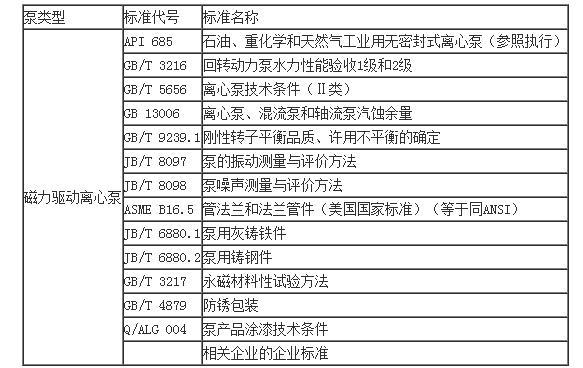 六、泵的設計、制造、檢驗應符合有關標準、規范的規定,常用磁力驅動離心泵的類型、標準代號及標準名稱見表1。