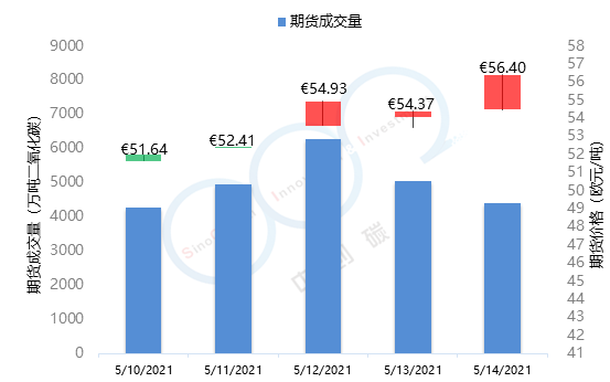 - 2021年5月10日至5月14日,由于歐盟碳市場投資者的強勢買盤以及歐盟氣候負(fù)責(zé)人對于歐盟碳價較為消極的干預(yù)政策,歐盟碳價在本周再次呈現(xiàn)較大漲幅并接連刷新記錄,由51.64歐元/噸上漲至56.40歐元/噸,漲幅達(dá)9.22%。