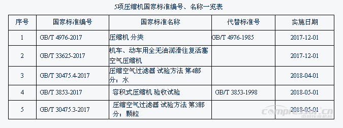 2017年第11號、第23號、第29號中華人民共和國國家標(biāo)準(zhǔn)公告,由國家質(zhì)量監(jiān)督檢驗檢疫總局、國家標(biāo)準(zhǔn)化管理委員會批準(zhǔn)發(fā)布了共5項壓縮機(jī)國家標(biāo)準(zhǔn),具體內(nèi)容見表: